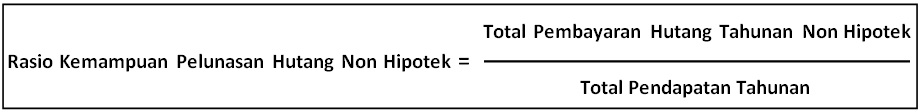 Cicilan hutang tahunan non hipotek Bapak Ali adalah KPM + cicilan kartu kredit. Sehingga didapatkan data 22.000.000 + 10.000.000 = 32.000.000. Sedangkan pendapatan tahunannya adalah sebesar 261.000.000. Maka rasio kemampuan pelunasan hutang non hipoteknya adalah 32.000.000/261.000.000 = 12,26 %. Sehingga Bapak Ali memiliki porsi hutang non KPR yang cukup baik, tidak konsumtif.